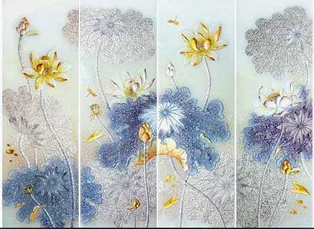 淡雅的百合、傲放的梅花、璀璨的桃花……現(xiàn)代浪漫型藝術(shù)玻璃多采用夾膠工藝制作,也有部門是在中間夾上碎玻璃,玻璃的內(nèi)面采用淺雕工藝雕刻花朵圖案,由雙層與三層玻璃制成,玻璃表面采用如水波浪的凹凸紋裝飾,再結(jié)合噴砂工藝,在花朵圖案上面灑上閃閃發(fā)光的微晶粉,從而營造出清新淡雅浪漫旖旎的迷離風光。